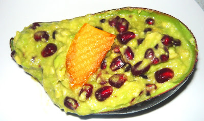 Em primeiro lugar, abram a o abacate, retirem o recheio e triturem, reservem as cascas. Depois juntem ao abacate a romã, as folhas de menta e o mel, misturem bem e encham novamente as concavidades dos abacates!!!
