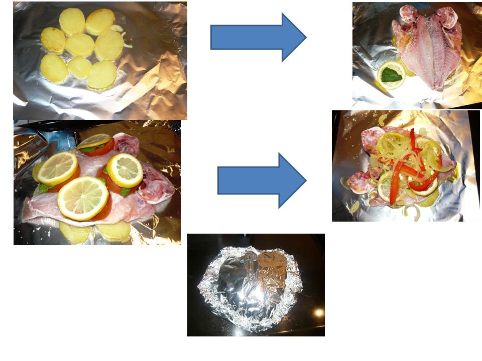Em primeiro lugar coloquem uma frigideira ao lume com 4 colheres de azeite, depois adicionem as batatas, previamente salgadas e pré fritem, ou seja, dêem uma cozedura rápida, depois retirem do azeite. Entretanto no mesmo azeite coloquem a cebola, alhos, pimentos, e deixem cozer durante 5 minutos. Pronto está quase. Agora vamos preparar a "cama " do peixe. Cortem uma folha de papel de alumínio, no centro coloquem as batatas, depois sobreponham o peixe e as rodelas de tomate, rectifiquem com sal. Depois em cada rodela de limão juntem uma folha de manjericão e sobre o limão coloquem a cebola, os pimentos e os alhos... fechem o papel de alumínio de forma a fazerem uma bolsa... levem ao forno durante 25 minutos a 200º... é um parto engraçado para fazer com amigos!!! 5 estrelas...